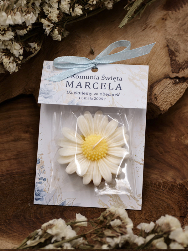 Podaruj swoim gościom wyjątkowy upominek w postaci ręcznie wykonanej świecy w kształcie stokrotki (kwiat dobroci i czystości, który będzie wspaniałym wyborem dla tych, którzy cenią naturalne piękno i symbolikę niewinności).